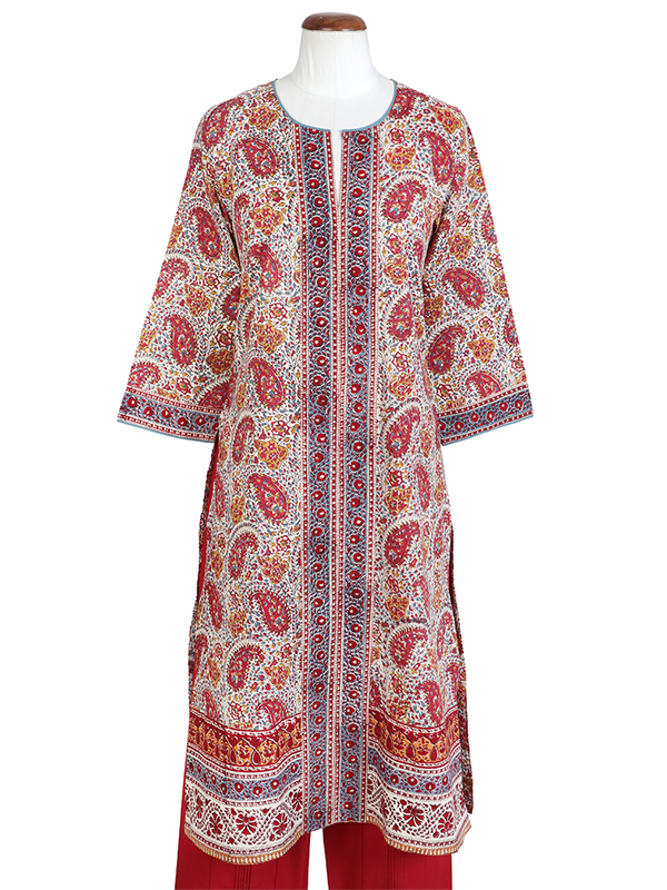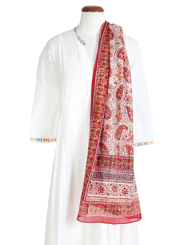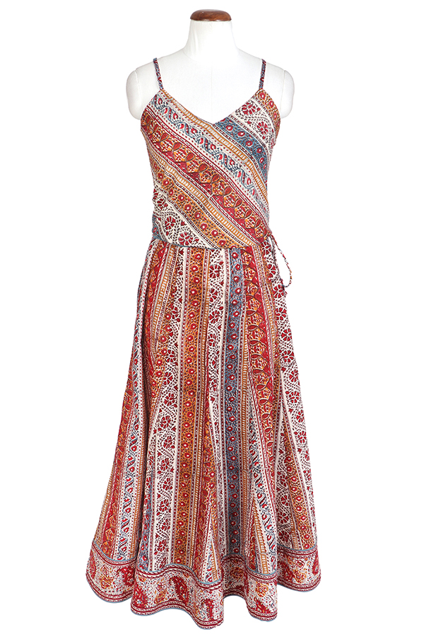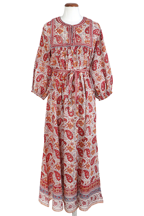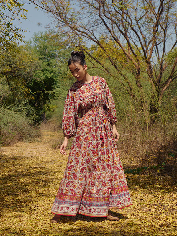 A dancing paisley in a festive palette of crimson & ochre with a splash of blue. Find our new ‘Wanda Dress’ with its vintage-inspired silhouette in soft, floaty cotton adorned with intricate borders, handmade cloth buttons & a cinching belt.