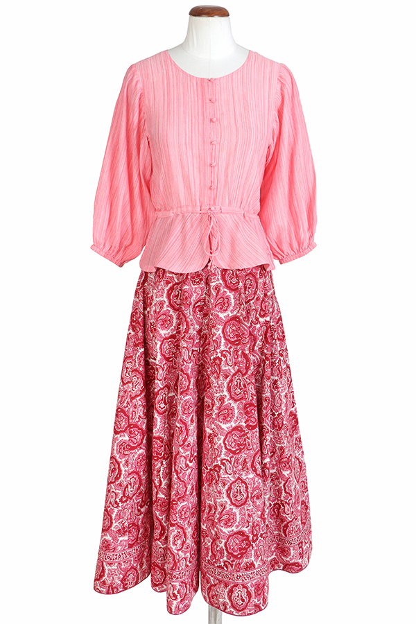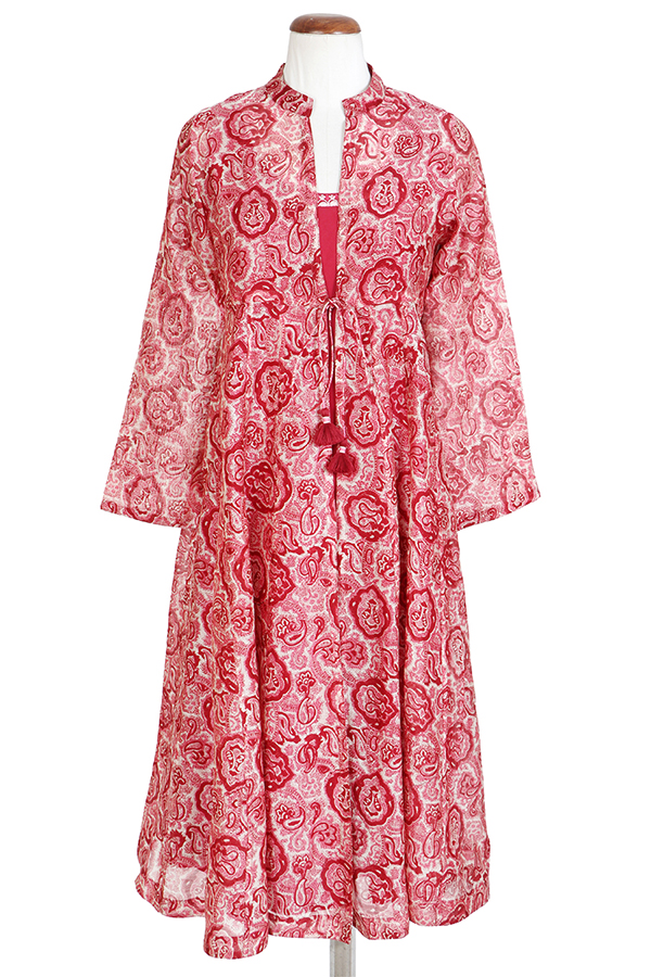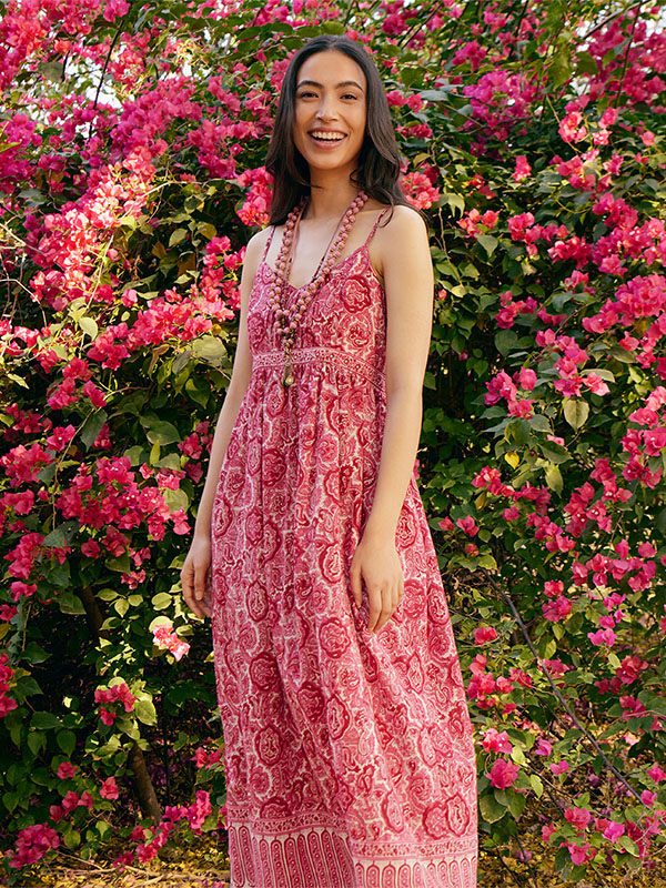 A bloom of pink as our latest collection ‘Beyaz’ reaches our stores. Find shades of blush & rose in sumptuous silhouettes, embellished with gold Khari printing, striking borders & fine stitching. Discover our new Rimini Dress as it makes its first appearance in this striking print.
