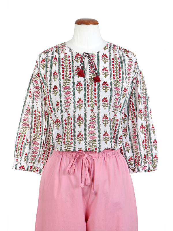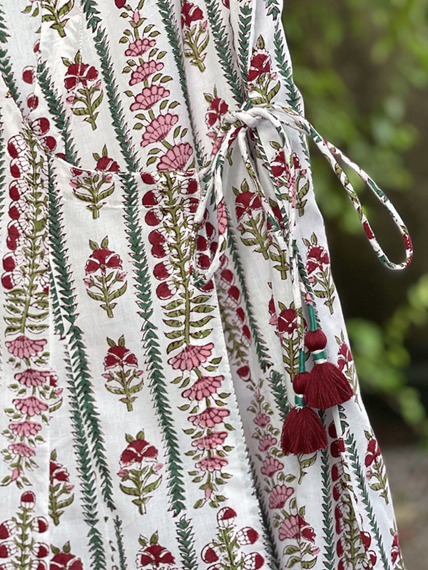 Our latest capsule collection, ‘Summer House’, features fine floral trellises in a refreshing palette that brightens & uplifts. Complemented by soft plain rose, this collection features delicate pieces adorned with handmade tassels, gold-printing & machine detailing.